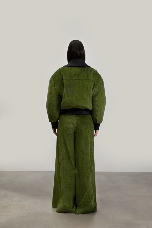 Wide-leg trousers with front pockets and a back pocket with red embroidery, "F-e" logo