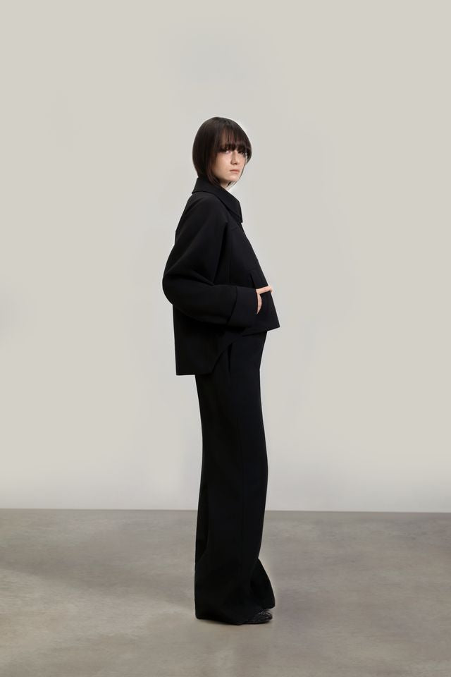 Casual wool jacket, shorter at the front, with front pockets and fastened at the center with wooden buttons inscribed with F. Egidio.