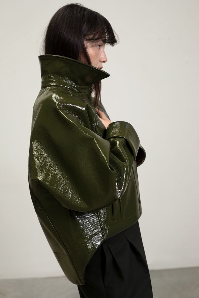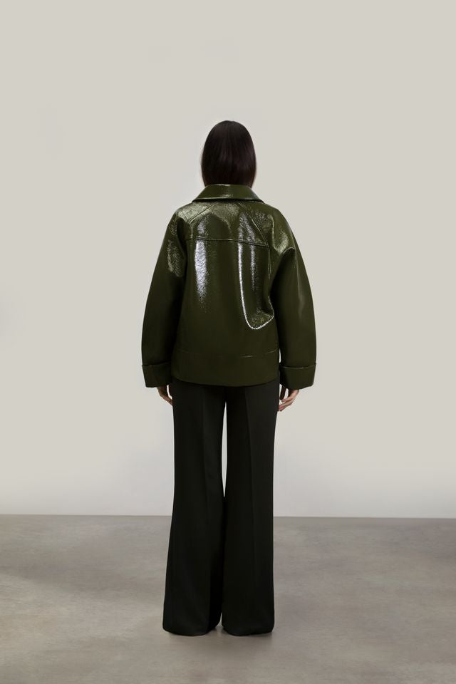 Casual jacket, shorter at the front, with front pockets and fastened at the center with wooden buttons inscribed with F. Egidio.
