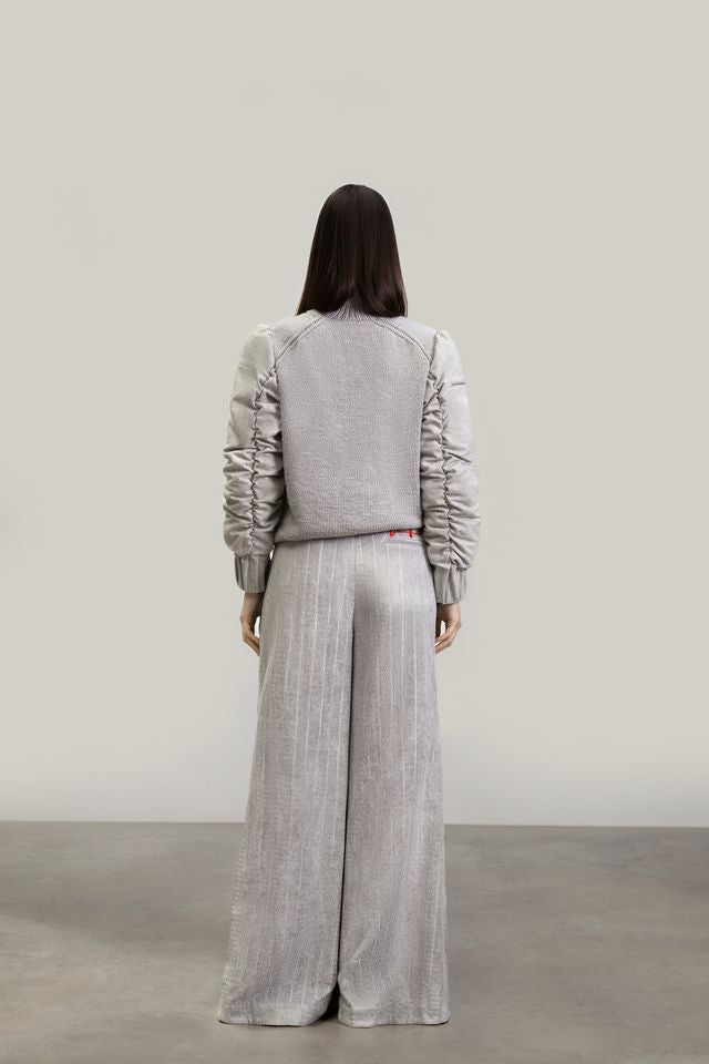 Hand-knitted sweater with puffed sleeves made of fabric. The sleeves have pockets with metal zippers and wide elastic cuffs.