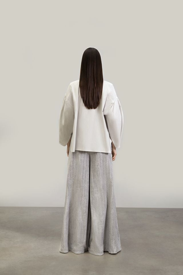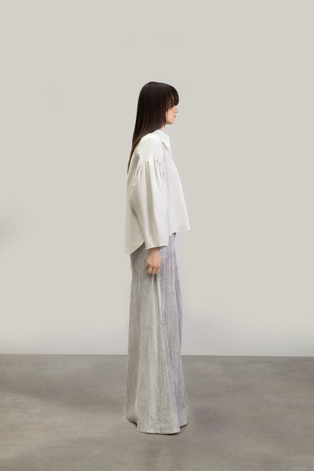 Oversized shirt, slightly shorter at the front, with puffed sleeves and a chest pocket with a small red embroidered "F-e" logo.