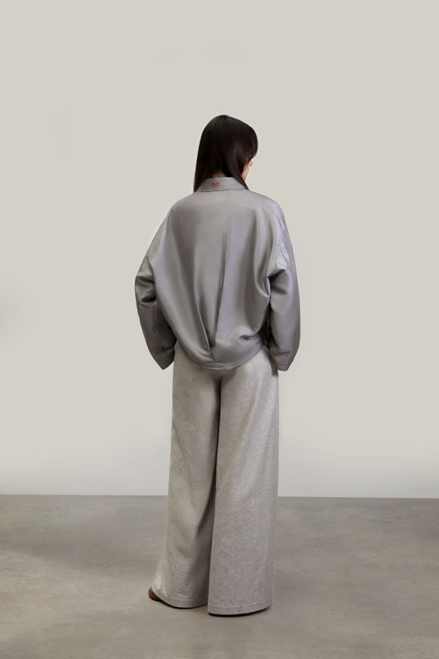 Loose-fitting shirt with long sleeves, lightly padded, slightly longer at the back, with a small red embroidered F-e logo on the collar at the back
