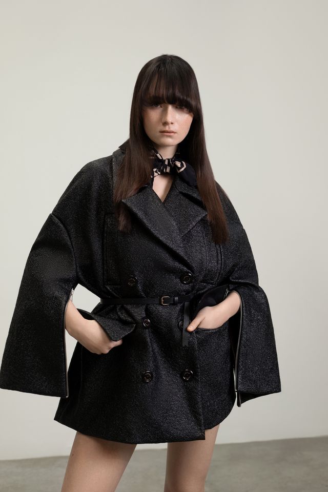 Oversized jacket that closes with two rows of wooden buttons inscribed with F.Egidio. It has four pockets on the front and metal zippers on the inside of the sleeves.