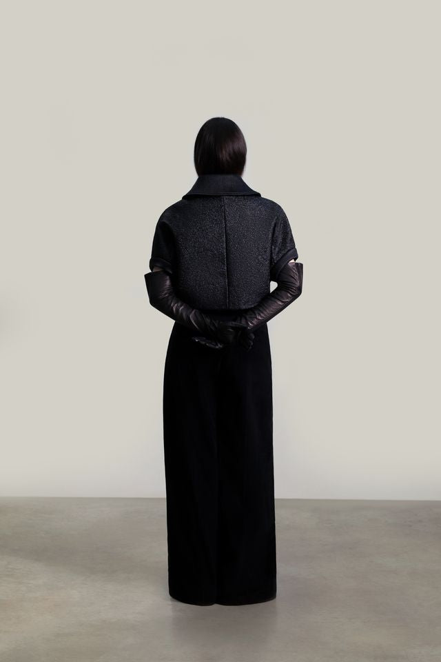 Short jacket with short leather sleeves and detachable leather collar, front pockets, and wooden buttons engraved with F.Egidio.