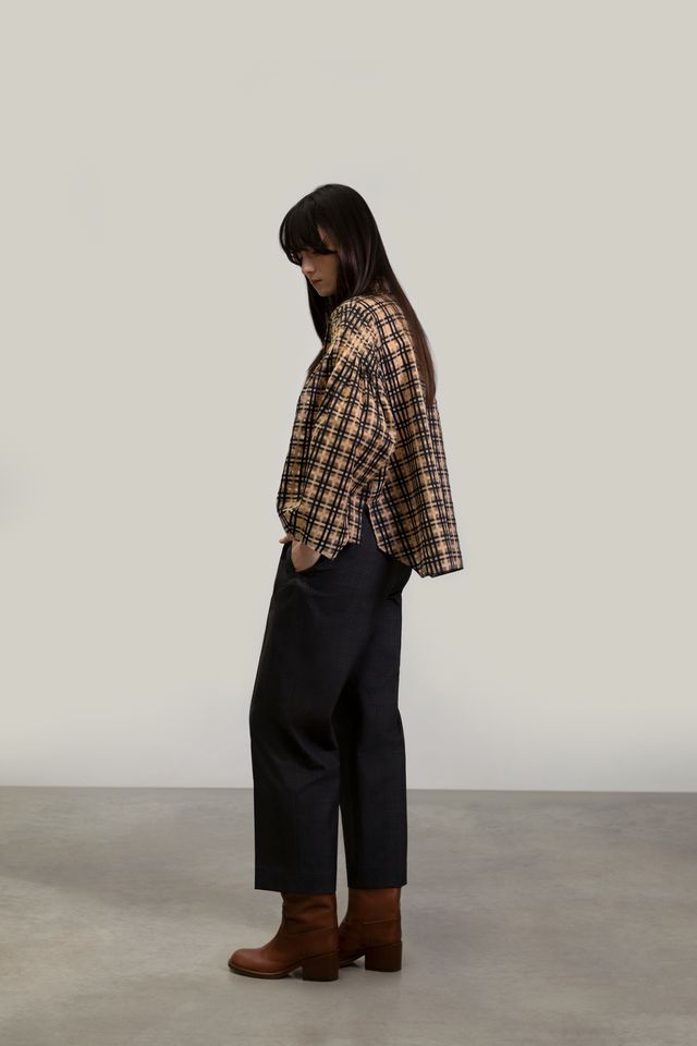 Oversized shirt, slightly shorter at the front, with puffed sleeves and a chest pocket.
